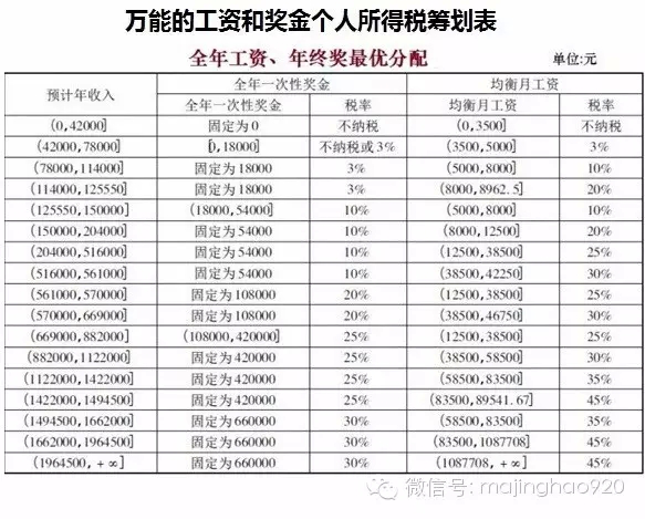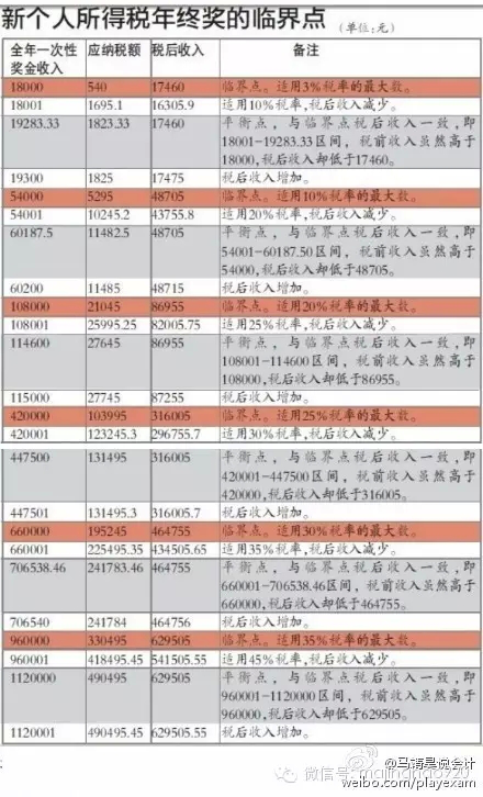 特别注意:多发1元奖金,很可能要多缴上千元税。按照新个税的规定,年终奖的计算中,一共有7个税率,出现了6个区间的临界点,才导致了年终奖“多发少得”的情况。这些临界点分别是:18001元—19283.33元、54001元—60187.50元、108001元—114600元、420001元—447500元、660001元—706538.46元、960001元—1120000元。